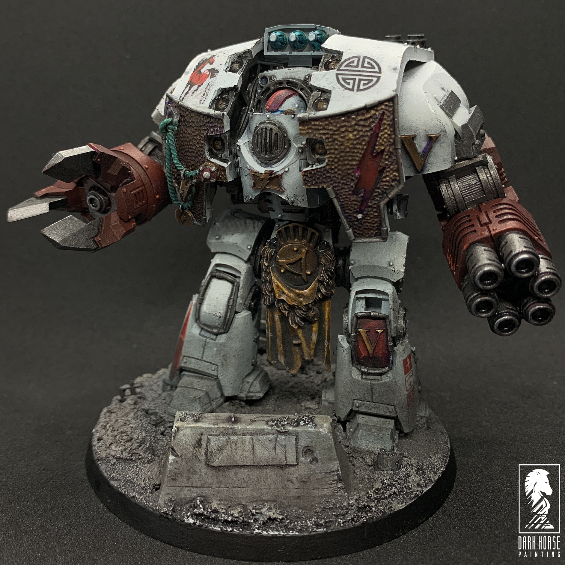 To focus back on the army, what is the deal with the Brotherhood of the Red Horse? Well, I had started printing my own decals not too long before that. I found that the lighter the surface you printed on, the better home-printed decals show. I had mostly used all-black decals, then started to get a bit more adventurous with color on my mostly grey Alpha Legion. I knew the white of the Scars would allow a wide-open pallet! So, when it comes to looking for images to use for decals, I throw my net wide. I could not even tell you at this point what came first…the idea for a Mongolian-style horse, or the image itself. Nevertheless, I found two great images that ended up becoming the basis for the symbol for my brotherhood. I found these beautiful watercolor red horses. I have a bunch of other Asian symbols across the army as well. And before you say the symbols should only be Mongolian/Chinese, please remember that this is a fictional world in science fiction, not an Earth culture! So, I can do what the fuck I want (respectfully).