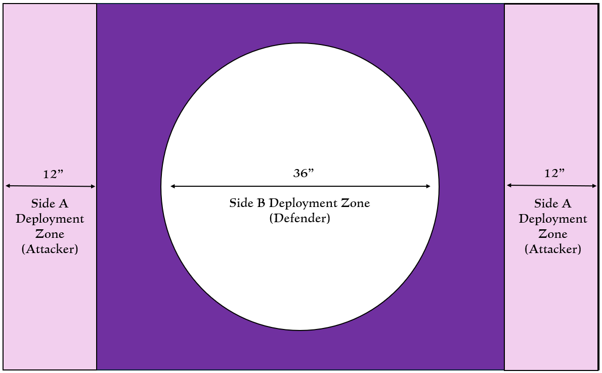 • The Defender then sets up three game objectives in their deployment zone. Each objective may not be within 6” of the edge of their circular deployment zone or 8" of another objective. They may be placed on the upper surface of fortifications, but if the fortification they are in is destroyed, they are themselves automatically destroyed with no saves. They may not be deployed inside intact buildings.