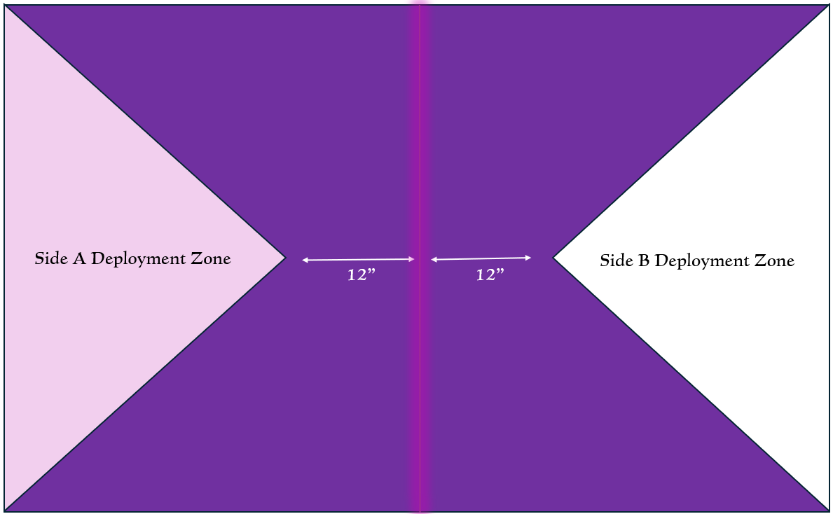• The player who deploys first deploys their entire force, except for any units held in reserve, into their deployment zone selecting one from the deployment zones shown.